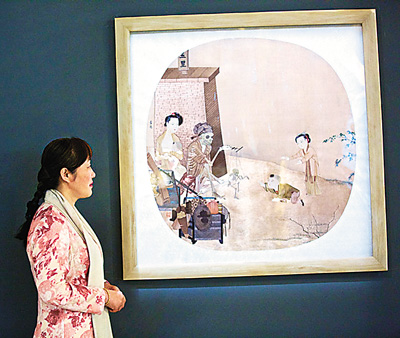 中国刺绣有着比纸上绘画更悠久的传统,参展艺术家、国家级“非遗”传承人姚慧芬用上百种不同的针法来再创作李嵩《骷髅幻戏图》、马远《十二水图》这两幅宋代古画。当皮影、刺绣和实时录像、动画、自动机械表的表演配合展示时,给人一种时空交错的感觉。
