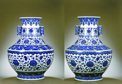 翰海春拍推出的“清乾隆青花缠枝花卉贯耳尊(二件)”是仿古佳作。贯耳尊取形自商周尊彝,多见六方式,古朴典雅。此件器物不同于一般圆器可拉坯成型,必须分块连接,制作工艺殊为复杂。其造型、尺寸及纹饰皆与南京博物院藏品相近。其体型硕大,内壁施白釉,外部青花纹饰为多层主辅式构图,共有十层之多,由口部至底部依次为海浪纹、花叶纹、缠枝番莲纹、如意云头纹、缠枝番莲纹、海水江崖纹、如意云头纹、主题缠枝莲纹、海浪纹、莲瓣纹。画工繁缛精美,青花线条清晰,层次丰富,釉面平整光洁,玻璃质感极强。观其青花发色,浓艳而不炫目,用点青法上色,系仿永宣苏麻离青结晶斑之效,故纹饰有深浅之别,浓淡相宜。此器内足较浅,底书“大清乾隆年制”六字三行青花篆书款。