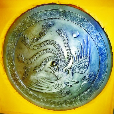 第二件是一面镜面直径达790毫米的唐代丹凤朝阳纹青铜圆镜。锈色斑斑的铜镜背景的纹饰,分成两个装饰区域:主体装饰区里,高浮雕塑造了一只展翅飞翔在云丛里的巨大凤鸟,朝着远方升起的一轮朝阳有力地追逐着。四条高高飘扬的羽翼整体呈现出浮动的S状造型,与凤鸟的侧身扭动的姿态,形成了强有力的三维空间舞动的视觉效果。辅助装饰区的镜面边饰,是环绕一圈的云气纹。与战汉时期的抽象几何形云气纹所不同的是,这面唐镜的云气纹设计,刻意表现出手动绘制的灵动生气。该铜镜形体巨大、纹饰生动、线条有力、细节传神、工艺精湛,铜镜背面整体图案纹饰,洋溢着朝气勃勃的旺盛活力。据荣振辉先生介绍,这面特大号铜镜的镜面直径,是全世界存世铜镜里最大的。