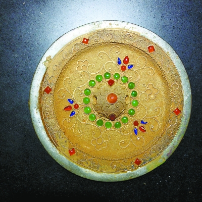第五件是一面唐代镶嵌宝石缧丝花卉纹鎏金铜镜。该铜镜镜面直径108毫米,在缠枝花卉纹的鎏金镜背上,镶嵌了红粉蓝绿四种宝石装饰物。凤凰彩票现场通过使用便携式硬度仪,测试各种镜面镶嵌宝石的矿物硬度,发现其中红色宝石的摩氏硬度为5度;粉色宝石的摩氏硬度为6度,应该是玛瑙石;蓝色宝石的摩氏硬度为5度,是一种猫眼石;绿色宝石的摩氏硬度为7度,竟然是满绿的高冰种翡翠。