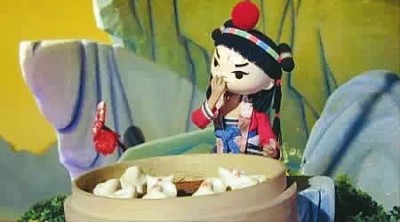 1958年出品的 《猪八戒吃西瓜》,则为中国动画增添了剪纸动画这么一个新品种,将中国最普及的民间传统装饰艺术之一剪纸运用到了动画作品中。人物造型依靠平面雕镂,动作吸取皮影戏装配关节以操纵人物动作的经验,环境空间则由绘制的纸片及贴在玻璃上的前后景构成,拍摄这样的剪纸动画,需要将纸偶平放在玻璃板上逐格拍摄。第二部剪纸动画———1959年出品的 《渔童》,已经尝试着将剪纸这一形式酿成独特的艺术风格,只见片中作为神话人物的主人公渔童,呈现出了舞蹈化的肢体动作,颇具装饰化的美感。到了1981年出品的 《猴子捞月》,这部剪纸动画已经一反传统剪纸刀刻剪铰明快犀利的造型风格,而是纯熟地从多种民间美术中汲取营养,比如,它深得皮影的精髓,也采用中国独有的水墨拉毛工艺,利用某些纸张在湿润情况下撕裂时所产生的纤维长短不一的边缘效果,使裂开的边缘看上去毛茸茸的,恰似动物的皮毛。