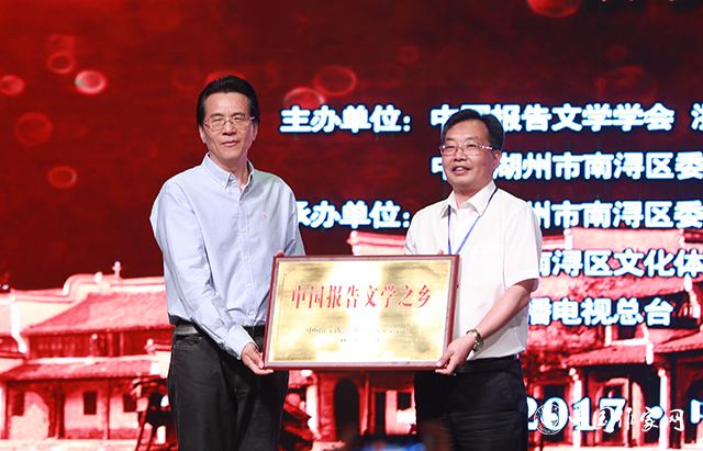 中国报告文学学会授予南浔“中国报告文学之乡”称号,凤凰彩票副主席何建明为其授牌,中共湖州市南浔区委书记夏坚定上台接牌 摄影:王纪国