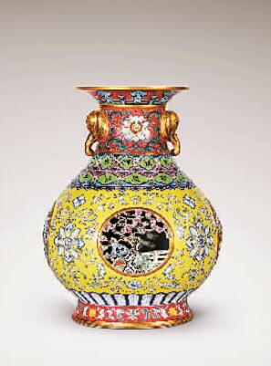 展出的仿清乾隆粉彩镂空象耳转心瓶 资料图片