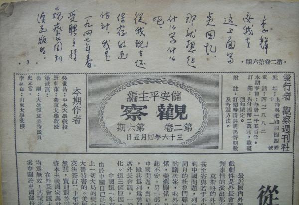 正好我收藏有一九四七年的《观察》合订本,拿去请方成为我题词纪念。没想到,他从第一页的开始写,洋洋洒洒,连续写了好几页,计有两千字。回忆,留恋,为刊物,也为储安平。谨摘录部分如下: