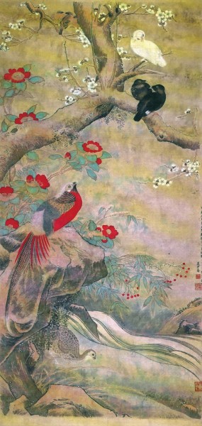 夏伊乔画作《锦鸡茶花》(局部)。