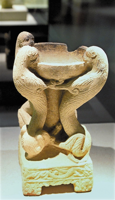 此次展览最受关注的当属“虞弘墓汉白玉石椁”。虞弘墓虽在唐代已遭盗掘,但出土文物的精美和丰富让人叹为观止,其中以汉白玉石椁最具代表性。石椁四面饰以精美雕刻,由50多个单体图案组成,图案中所描绘的人物均为高鼻深目、棕肤黑发的地中海高加索人种,图中的人物、动物、服饰、器皿、乐器以及花草树木的美术风格、造型特点,均带有极明显的中亚波斯风格。雕绘内容中的宴饮、乐舞、射猎、祭祀、家居甚至酿酒等画面,不仅生动地再现了墓主人万里之外故乡的风土民情,也为后人研究虞弘所信仰的北朝三大外来宗教之一的祆教,提供了丰富的第一手资料。(韩墨/图)