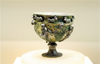 ▲人物动物纹鎏金银高足铜杯(公元5-6世纪)。