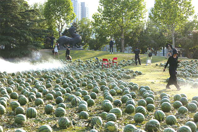 “2017中央美院毕业季”以“约定”为主题,位于主教学楼前的大片“瓜田”是本次毕业季学校带给学生的第一份惊喜。3500个西瓜在当日凌晨被一车车运进校园,并在一夜之间布满草地。“开花结果”“硕果累累”“顶呱呱”,除了“瓜田“这份意涵丰富的惊喜,学校还为每位毕业生准备了由各个学院老师们精心挑选并随机送出的礼物,一张鲍勃·迪伦的黑胶唱片、一幅老师亲手制作的作品、一块学校美术馆的墙砖,无论何种形式的礼物,当拆开包裹的时候,学生脸上都洋溢着同样的惊喜,而这份礼物也会同他们对母校的美好回忆一起被永久珍藏。