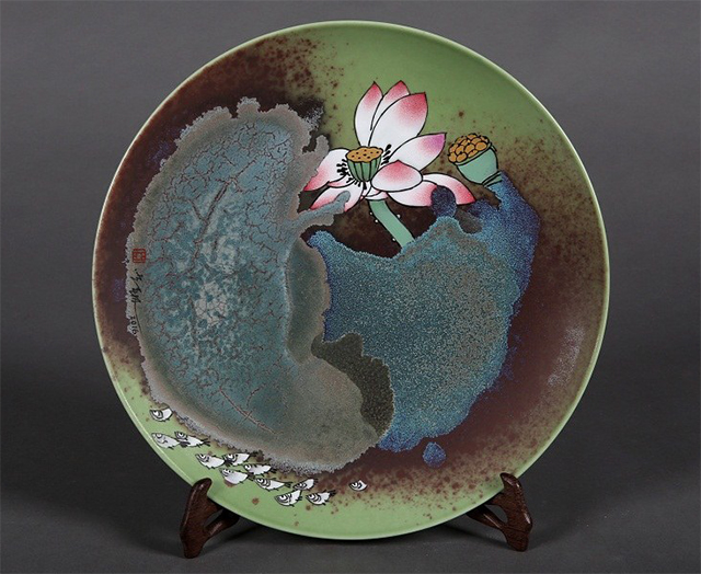 宁钢娴熟地将传统中国文人画中擅于呈现的梅花、荷花、鹤等美好意象,运用传统陶瓷工艺技法,红、金等底色丰盈运用,黄、绿等色块交错对比配置,传统民俗色彩与现代西洋色彩冲突效果融会贯通,再糅入颇富现代设计感和现代构成感的视觉新元素,实现了陶艺形体、釉色和瓷画艺术的完美结合。