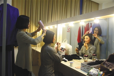 张火丁在后台给学生整理头发
