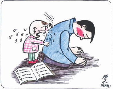 老九的漫画有智慧。喜剧需要夸张,但夸张不是目的,夸张是要揭示出生活中的悖谬,让悖谬在夸张中放大、突出,从而让人从生活现象中发现和感受到悖谬。漫画家的智慧,就是要用夸张的形象手法来展现悖谬,来制造喜剧效果。老九善于发现悖谬,善于制造这种喜剧,其手法是颇为巧妙的。比如,其邮票漫画,常常把邮票上的画面与邮票外的画面合为一体,使邮票画面具有了双重身份:一方面仍然不失为邮票,一方面又成为更大画面的组成部分,而且漫画家能根据邮票画面的内容来构思整个画面,打破界限,化虚为实,从而制造喜剧效果。甚至只是将两个形象摆在一起,就构成了一个张力场,如弥勒佛与蒙娜丽莎的那幅漫画,两个人物既有姿势的相似又有形象的根本不同,于是顿时就有了喜剧性的笑。又如《爸爸,瞧你给我做的作业全错了! 》 ,画面是父子的地位发生了颠倒,父亲跪在地上,一副愧疚的、做错事接受惩罚的样子,而儿子一面哭着一面用小手捶打父亲,整个画面极具喜剧效果,也是题材、手法完美结合的表现。又如《兔子取经》 ,龟兔赛跑之后,兔子吸取教训,居然也像乌龟一样背上了重重的龟壳!这样的情景,真是匠心独运。在这里,老九往往能够突破日常思维习惯的束缚,创造出出乎人们意料、又合乎一定情理的作品。这样,就创造出所谓的无理而妙。