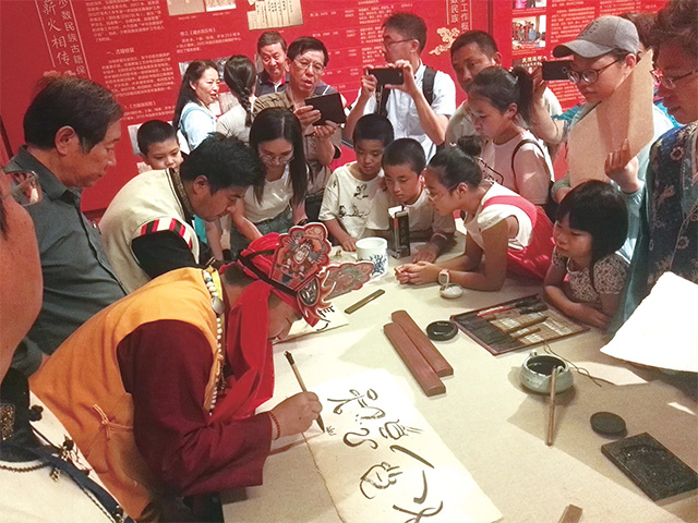在北京站的巡展现场,身着民族服装的东巴现场书写的东巴文字成了观众们热抢的目标,观众们手拿东巴纸,排队等着东巴写下自己想要的吉祥语——“天道酬勤”“吉祥幸福”……