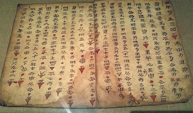 东巴文《东巴舞谱》,为纳西族古老的宗教东巴教记录和传授跳神舞蹈的仪式程序、内容、跳法的一种经典。共记录了34种东巴舞蹈。