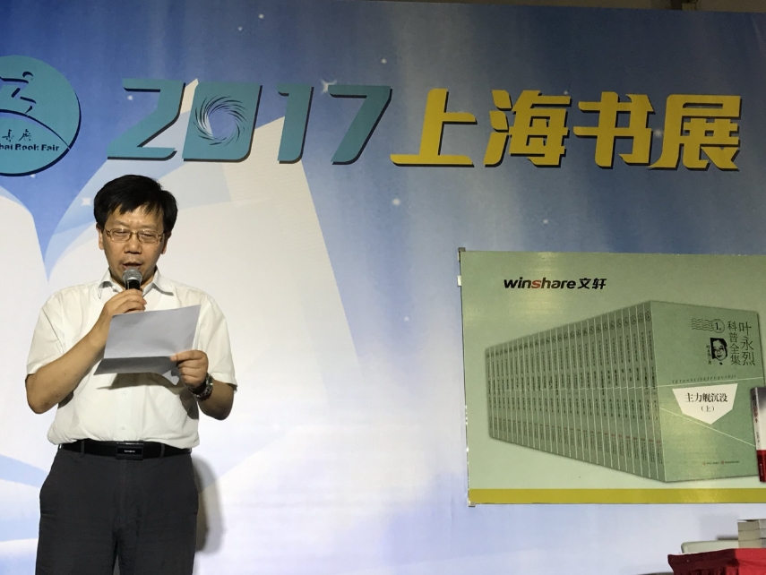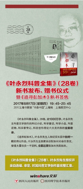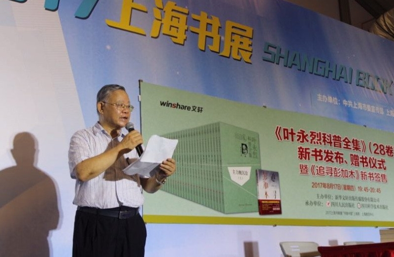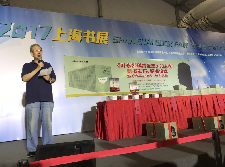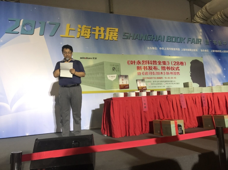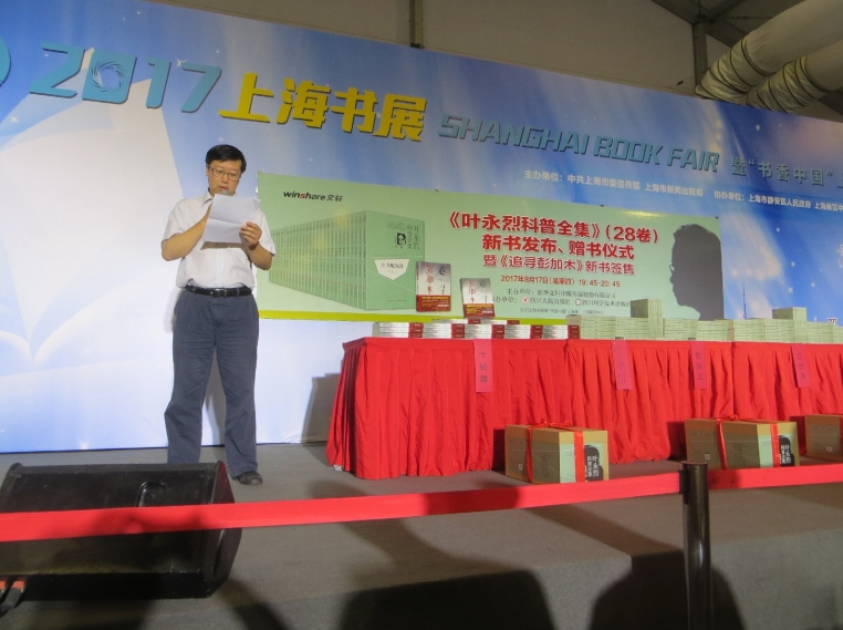 2017年上海书展《叶永烈科普全集》(28卷)新书发布、赠书仪式暨《追寻彭加木》新书签售活动今天在这里隆重举行,我谨代表上海市科普作家协会对这个活动的成功举办表达祝贺,并向叶永烈先生表达由衷的敬意。