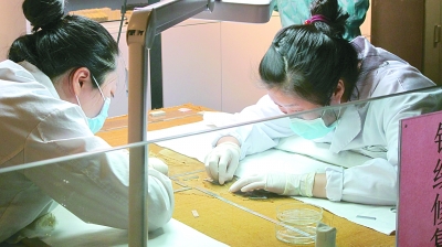 新疆博物馆文物科技保护中心技术部工作人员马叶桢(右)和同事在给我——黄色毛残片“治疗” 图片为王一坤摄/光明图片