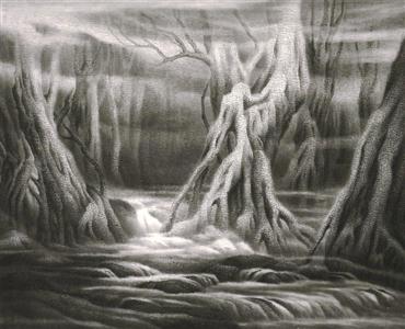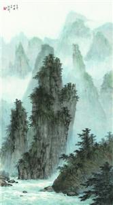 张弛的山水画,汲取了东瀛水墨画的养分,作品虚幻之境的获得,在很大程度上来自“水晕墨幛”的运用,反复渲染,使作品形成了层次丰富又统一的调性,这是中国画不太具备的一种艺术品质。同时,她继承了中国画讲究笔性的艺术特征,大块面的点子皴和描写根须与坡石的折带皴,不仅与多调性的渲染融为一体,而且赋予画面以幽深微茫的山水意境。