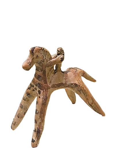 还有一件文物在涉及马的驯化时也会经常被提到,那就是乌尔旗(或译成乌尔标准)。英国国家广播公司BBC与大英博物馆联合打造的《大英博物馆世界简史》,以馆藏的100件文物为线索串起世界历史,其中提到苏美尔文明时,介绍的也是这件文物。它出土于乌尔城第779号墓,墓葬时间为公元前2600年左右,距今已有4700年的历史。因被发现在一个战士的身边,被认为是乌尔王的庆功旗帜。乌尔旗是用贝壳、天青石与石灰石在木板上镶嵌出来的马赛克艺术品,其中的一面饰板描绘的是战争情节,上下共划分三层,最下层为军队的出征与凯旋,四轮战车奔驰战场,车上站着驭手,右边第一辆象征着军队出征,第二辆至第四辆战车的马下面躺着敌人,即表示在战争中获胜;最上一层,中央是乌尔王,身后是他的卫兵和马车。这些战车的画面至少说明距今4700年时,野马肯定是被驯化了。本世纪初大英博物馆曾经举办过一个关于马的文物展,遴选诸多从两河流域到地中海文明的与马相关的文物,可感叹人与马的如影相随。