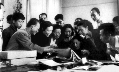 国家博物馆图书馆里有几个楠木展柜,陈列了一些古籍善本。李之檀先生手扶展柜,摸索几下,喃喃自语:“这个柜子是我参与设计的。”在图书馆二楼通往三楼的楼梯间墙壁上,挂满了老照片,其中一幅是1961年,沈从文先生为美术学院的学生讲授古代丝织品。还有一幅与沈从文先生有关的老照片,是李之檀先生在《中国古代服饰文化参考文献目录》一书中找到的,照片上,沈从文先生正兴高采烈地为来自北京人民艺术剧院的人们讲解服饰知识,沈从文先生身后站着的年轻人,即青年时代的李之檀先生。