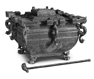 此件战国青铜冰鉴堪称世界上最早的冰箱,也是当时祭祀中重要的礼器。其常用来冰酒,使用时,方尊缶内装酒,鉴、缶壁之间的空间放置冰块。