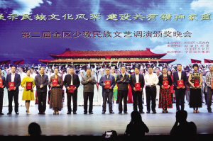8月28日,本届文艺调演颁奖晚会在宁夏大剧院举行,白尚成、王儒贵、马力、安纯人等自治区领导出席了颁奖晚会并为获奖节目颁奖,自治区党委宣传部、统战部、民委、文化厅等部门和参演单位的负责同志与各族群众一起观看了演出。