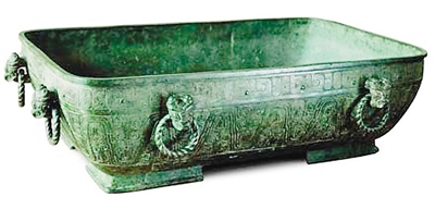 原始初民的浴具以实用为主,但也不乏审美元素,各类浴具上往往刻有各类几何纹,直线、曲线、水纹、三角纹、漩涡纹、锯齿纹等等。现存最古老的浴器“虢季子白盘”,青铜质地,盘口呈圆角长方形,曲尺形足,饰有波曲纹,沉雄厚实,线条雄健。春秋到两汉时期的浴具,无用之用的美学功能更加凸显。如吴王夫差鉴,两侧口沿旁刻有两只小龙,前足在口沿,后足蹬着器壁,作探头状,如同窥浴,神气活现,生动活泼,充满了生活情趣。还有一些浴具如陶杅、沐盘等往往饰以贝纹、蟠螭纹、夔纹等纹饰,装饰繁复华丽,姿态万千,简直就是观赏艺术品。