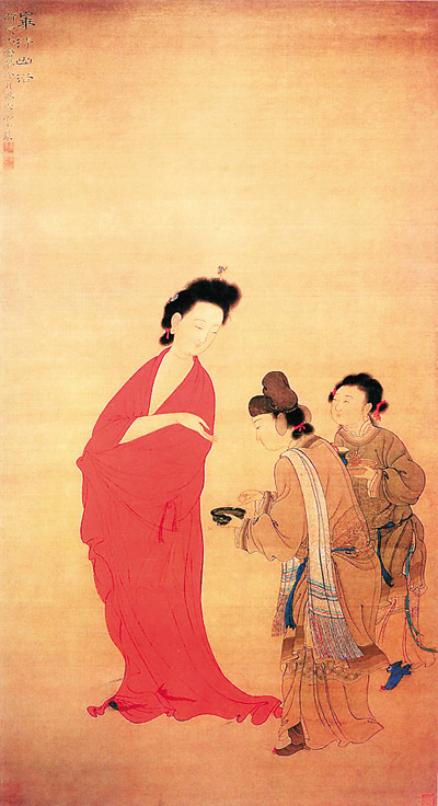 “贵妃出浴”在诗词中也数不胜数。“春寒赐浴华清池,温泉水滑洗凝脂。侍儿扶起娇无力,始是新承恩泽时。”(白居易《长恨歌》)“帘影罢添新翡翠,露华犹湿旧珠玑。”(徐夤《华清宫》)“百媚千娇出浴时,君王凝盼转魂迷。”(周端臣《题真妃出浴图》)“温泉暖滑留余香,芙蓉出水红生光。”(姚勉《题杨妃出浴图》)“出浴太真冰作影,捧心西子玉为魂。”(曹雪芹《红楼梦》)……这些都是脍炙人口的佳句。“贵妃出浴”从唐经由宋后,从对人体美的赞誉一跃成为“至美”的代名词。如明代戏剧家朱权赞王实甫《西厢记》时说:“王实甫之词如花间美人,铺叙委婉,深得骚人之趣。极有佳句,若玉环之出浴华清,绿珠之采莲洛蒲。”(《太和正音谱》)正是用“贵妃出浴”来喻指文章之妙,得句之佳。