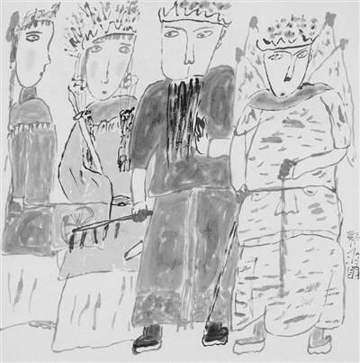 4 您的漫画多而杂,人物造型夸张,看起来简单,又模仿不出来,几十年一贯保持着荒诞天真的妙趣。《景阳冈武松打虎》《红楼梦人物》《韩信月下追萧何》等等,这些小说和历史上的人物都经过您笔下演绎,呈现出令人忍俊不禁的别样神采,这是怎么得来的?