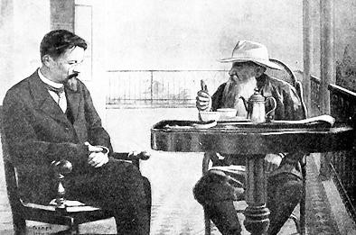 在1957年上海人民美术出版社出版的《契诃夫画传》中,有这样一幅照片:一个简朴的阳台,桌上放着小小杯盏,托尔斯泰似乎在向契诃夫“训示”着什么,后者谦卑地将双手交叉在一起,高大的身体佝偻着,低着脑袋,朝他的方向倾听着,像是一个温顺的农妇。这是契诃夫为数不多的对托尔斯泰的拜访景象之一。它让人想起契诃夫成名后的那句话:如果托尔斯泰还活在这个世界上,我就觉得有依靠,即使自己写不出什么,也让我感到安稳。如今,眼前坐着的,就是一个可以笼罩他文学事业的艺术上的巨人。很显然,他的温顺,让这样一个同样欣赏他才华的强者感到高兴: