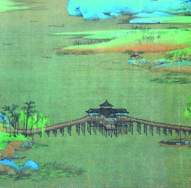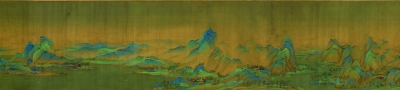 高耸的山峰和鲜亮的青绿色彩,是小提琴不断演奏出的主旋律,丰满厚实;缓坡、沼泽、流水恰似竖琴拨出的慢板,舒缓悠扬;高挂的瀑布和巉岩悬崖就像低音鼓敲击出的节奏,铿锵深沉;建筑、舟船和人物活动如同长笛吹响的快板,轻盈跳跃。画中的各组群山不是简单地循环往复,而是有许多变化,如变换山体造型、增换瀑布和溪流以及建筑群等,细节变化则更多、更丰富,如同乐曲中的“变奏”。不同的节奏与情绪,在不断地交织、变化中融合,一起奏响了北宋宫廷文化的灿烂之声。