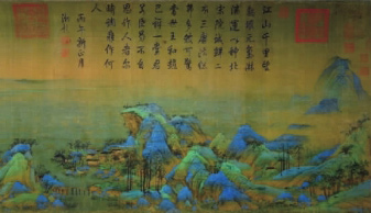 徽宗“诲谕”王希孟画《千里江山图》卷,是为了提振青绿山水、特别是要开创大青绿山水的绘画语言。王希孟除了在画学受到过基本训练之外,几乎是一张白纸,极易领会并实现徽宗的意图。当时的李唐、朱锐等人的手法已经定型,重塑的难度比较大。王希孟敢于大量使用石青石绿,这在以往是极为少见的,相信这是他的观山所得:苍翠葱郁之山,近则呈绿,远则显青,原因是空气的厚度改变了远处山林的本色。画家继承前人用色之法,概括提炼出青绿二色。