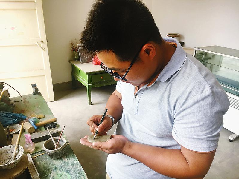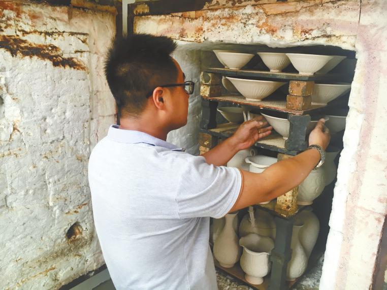 李和平展示自家瓷坊里烧制的青釉刻花执壶