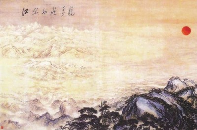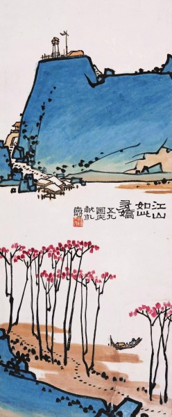 不少艺术家都曾以 《江山如此多娇》,表达对祖国的祝福,也引无数观者折腰。最为耳熟能详的,当属如今悬挂于北京人民大会堂的巨幅山水画 《江山如此多娇》。那是山水画名家傅抱石与关山月历时四个月合作完成的,高5.5米,宽9米。画面上旭日东升,江山壮丽,新中国的勃勃生机喷薄而出。画面巧妙地融祖国山河的东西南北、春夏秋冬于一体,近景是江南青绿山川、苍松翠石,远景是白雪皑皑的北国风光。创作过程中,两位名家各自发挥所长,傅抱石负责画流水瀑布,前景的松树和远景的长城雪山则由关山月来完成。1959年9月29日晚上,这幅巨制亮相于当时新落成的北京人民大会堂。同样名为 《江山如此多娇》 的画作,国画大师潘天寿也画过一幅。画面以空勾无皴的造型方式、清丽脱俗的设色方式,呈现出祖国山河的另一种锦绣。