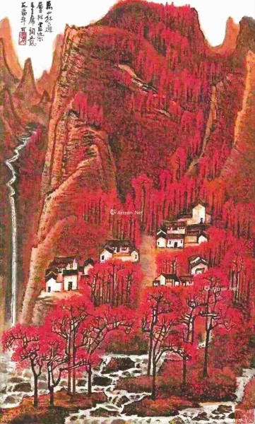 1962年至1964年,李可染用故宫内府有着刻骨般红色的朱砂画了多幅 《万山红遍》。画面尺幅不一,但主调都是红,朱砂和墨色交相辉映出一派金秋景色,层林尽染的群山顶天立地,错落其间的飞瀑、白墙、云气则像被挤出的留白,因周遭浓郁色彩的映衬,愈发显得明亮夺目、摄人心魄。至于所画景致,据说既非岳麓山,也非橘子洲头,但似乎比实景描写意境更高、更富于感染力,可以理解为艺术家澎湃激情的倾泻。
