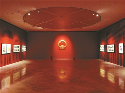 一进关山月美术馆,大红色的“新中国形象设计”展厅分外醒目。中央悬挂了庄严的国徽,两边还挂着全国政治协商会议的会徽、共青团团徽……