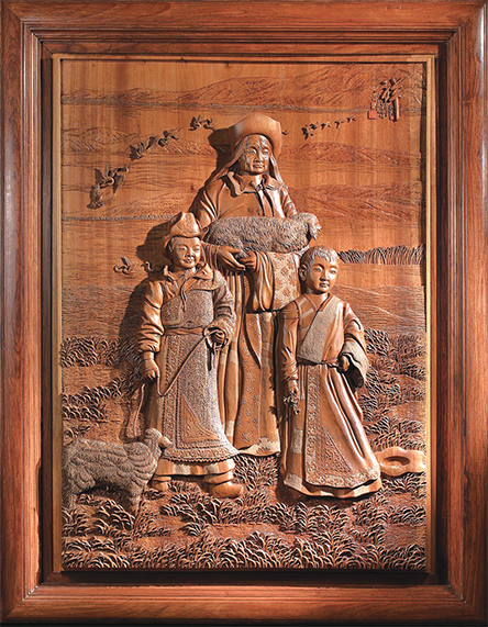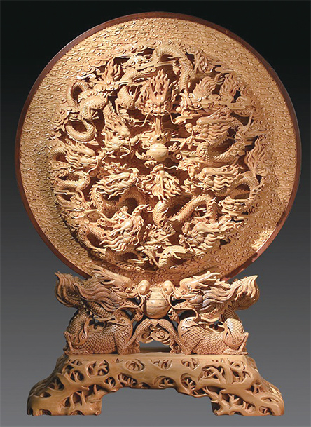 中国木雕的历史源远流长,很早就出现了初具雏形的木雕工艺品。其中,东阳木雕约始于唐,是一种以平面浮雕为主的雕刻艺术,因其色泽清淡,保留原木天然纹理色泽,格调高雅,又称“白木雕”。黄小明16岁从事艺术雕刻,是被称为“木雕宰相”的黄紫金的第三代传承人。他在继承传统的基础上勇于创新,每件作品都融入独特的构思和理念。他独创竹简式木雕、超写实木雕、速写木雕、取景框木雕,以“造景”手法和“物象”表达“化境”的哲学思考。他将传统艺术风格与中国现代审美融会贯通,开创了传统与创新并重的现代建筑装饰艺术新风格。他积极探索木雕艺术在建筑和佛教艺术装饰领域的应用,曾为九华山大愿文化园、南京牛首山等佛教胜地创作木雕装饰。