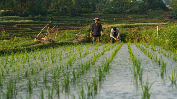 农民我是真的没经验,插秧之前没弄过,我都没见过田什么样,不过我形体好(笑),学得快,人家都插三四根,我就插七八根五六根,就跟当地的农民学,看着他们插秧,挑担子。