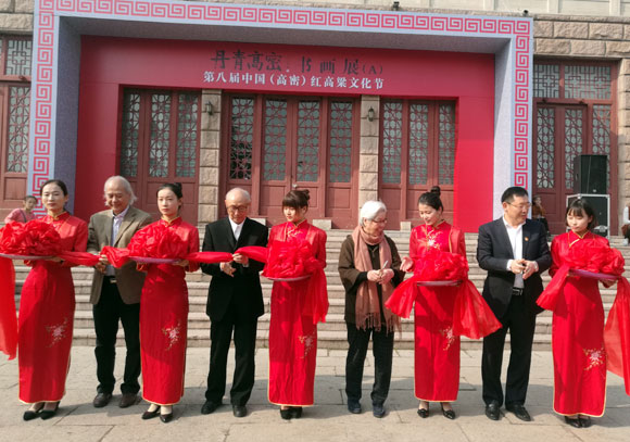 图为中共高密市委书记杨建华(图右一)、著名美术评论家邵大箴(图左二)、著名画家单应桂(图右二)、著名画家谢麟(图左一)为第八届中国(高密)红高粱文化节红高粱之约·丹青高密书画展剪彩。