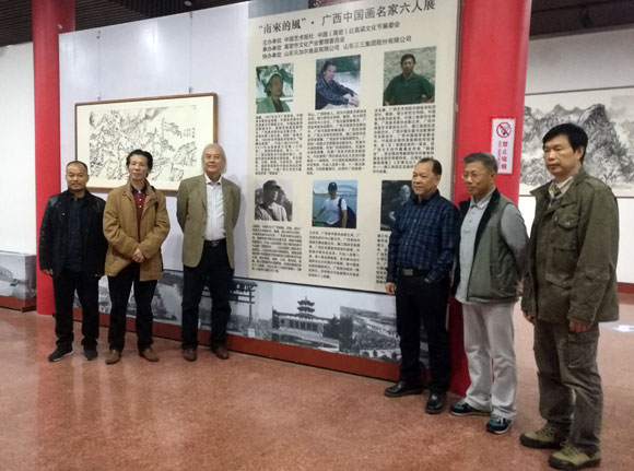 图为广西中国画名家谢麟(左三)、阳山(左二)、余永健(右二)、白晓军(右三)、王庆军(右一)、潘正华(左一)在红高粱之约·丹青高密·南来的风画展现场合影。