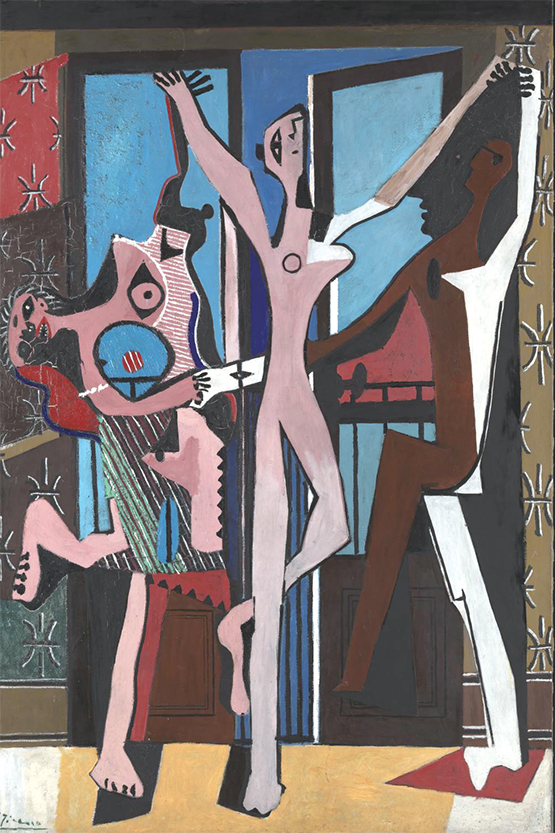 舞者们身后是通向阳台的门。右半边门上部是打开的,下部却似乎还未打开。阳台之外,可能是天空,也可能是地中海。对于立体主义来说,透视法则已经完全失效,画家不再忠实复制肉眼所看到的东西,而是创造前所未见的视觉形式。毕加索曾说,比起《格尔尼卡》来,他更喜欢《舞蹈》这部作品,因为“它更是一幅真正的画——一幅仅为其自身而没有任何外部考量的画”。也就是说,这是一幅纯粹的画,没有文学叙事,更没有政治宣传目的,仅仅是舞动的线条和奇异的色块组合。用克莱夫·贝尔的话说,这就是“有意味的形式”。