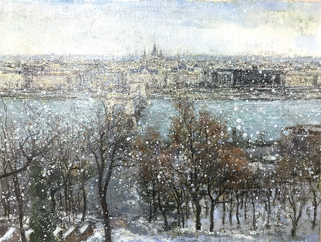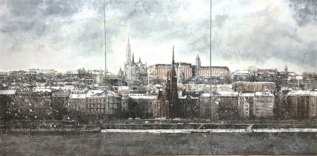 2014年春,我在北京画院美术馆初次见到了庄重的油画作品。在他所擅长的倒影和俯瞰航拍主题作品中,最打动我的当属那些淡雅朦胧的倒影系列。“有点儿巴比松、有点儿印象派、有点儿柯罗、有点儿莫奈”,是我对其画作的第一印象。同是2014年,我因协助画院筹备次年举办的齐白石首次境外大展而数次去往匈牙利首都布达佩斯,随着对这座多瑙河畔的城市了解越多,好感也就油然而生。我喜欢住在布达山顶的渔人堡旁边的酒店,并非因为这里守着旅游景点,而是因为这里离国家美术馆只有咫尺之距,便于我观展开会。记得初冬那次,恰好庄重发来微信问候,我随手发给他一张我刚拍的照片,那是酒店窗外冬日晴空下的渔人堡和多瑙河。没想到他很快回复,他年初才刚来过布达佩斯看过卡拉瓦乔大展,印象极好,也有颇多创作欲望,一拍即合的凤凰彩票畅聊了许久。第二天由于时差缘故,睁眼已是国内时间午后,手机却已有几条微信留言。打开一看,庄重竟一夜之间根据我发给他的照片将两幅油画小稿创作完成。我看罢激动不已,两幅小稿不仅契合我身临其境之感,更是他最擅长的画风,我随即回复他,“你以东欧主题创作一个系列办个展览如何?我来给你策展。”于是,源于一张照片的偶然触动,不谋而合的凤凰彩票在近三年的不断探讨和打磨中最终呈现出本次“意象东欧”主题展览。那张意外唤起他创作欲望和灵感的照片,则成为了展览中的《布达佩斯之一》和《布达佩斯之三》,也是本次“意象东欧”展览中艺术家最先完成的作品。