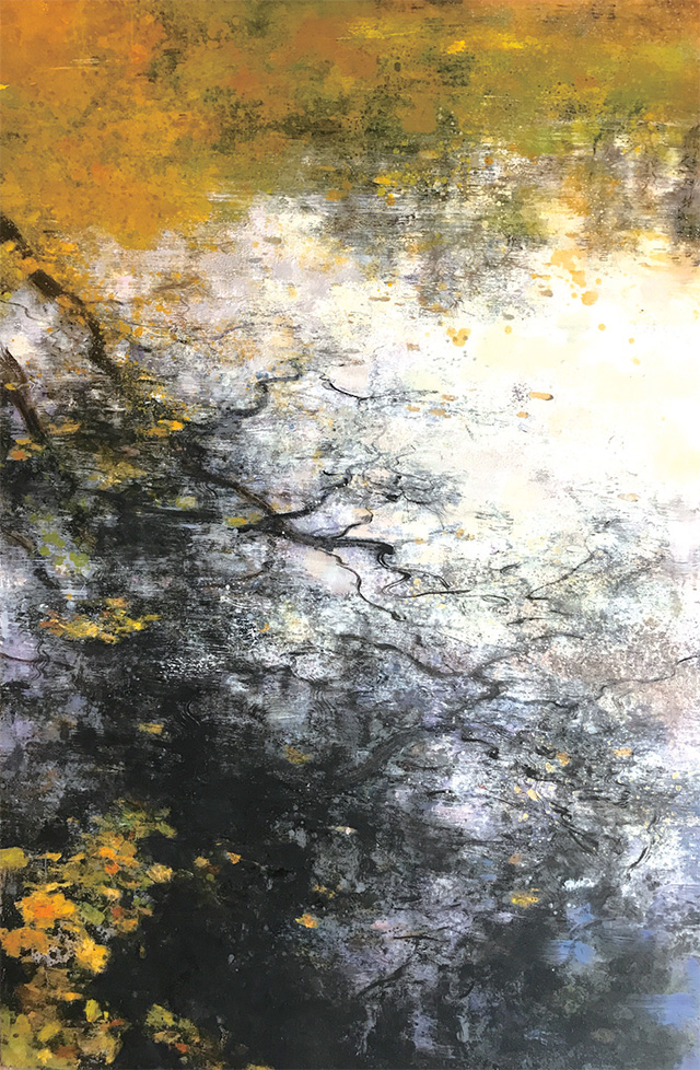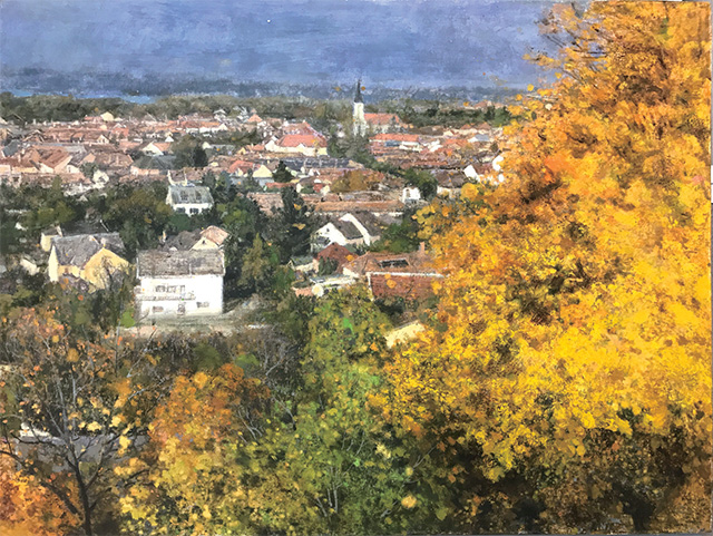 在西方油画中,风景画从最初文艺复兴时期的配角到17世纪真正成为主角自成一派,再从罗斯达尔和洛兰的写实派、透纳和康斯坦布的浪漫派到莫奈、毕沙罗和西斯莱等人的印象派,经历了漫长的实践和演变过程。但和我国传统绘画一样,所有的发展都建立在对传统的延续基础上再创新。品读庄重的作品,最令我欣赏的有两点。首先,便是吸收西方历代大师在风景画创作中最独特的元素并为己所用,从经典中汲取养分是从古至今每一位艺术家的必修课,但如何从临摹别人的作品转化为自己的风格却绝非易事。如果把庄重较为代表性的倒影和航拍俯瞰两个系列看作是他带有实验性的突破尝试的话,“意象东欧”中的这组创作则显示出他向传统风景画致意的决心。《无名小镇》系列中树木在风中摇曳的状态带着柯罗的痕迹;《秋色连波》系列中师法莫奈描绘荷塘中光影的斑斓;《布达佩斯》系列中描绘远景时的虚无所借鉴透纳的空气透视,多位风景画大师最具辨识度的细节都能从庄重的画作中寻得蛛丝马迹。这些元素汇集到一起,结合他独立的个人视角,呈现出他心中的东欧印象。
