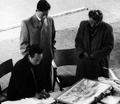 1979年张仃(左)在首都机场壁画《哪吒闹海》绘制现场。资料图片