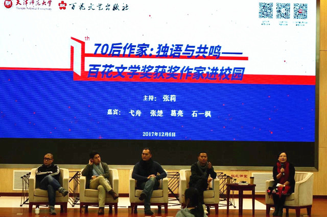 70后作家是一个不事喧哗的坚实、成熟的群体,成长过程经历了改革开放前后不同的社会形态,纷繁的变迁与涌动的思潮使他们对于自我和文学的认知都明显不同于新时期作家和“80后”作家。无论诗歌、散文还是小说创作,70后作家都显现出一种冷静而沉郁的气质,并表现出越来越强烈的时代关怀和现实书写,积极探索个人叙事与时代精神的融通与契合,向着历史与人性深处不断掘进,成为青年作家的中坚力量。2017年12月6日,获得第十七届百花文学奖的四位70后作家葛亮、张楚、弋舟、石一枫走进天津师范大学,与在校师生进行了一场主题为“70后作家:独语与共鸣”的对谈,共同研讨70后写作者的精神际遇与美学追求,分享个人写作历程。对谈由天津师范大学文学院教授张莉主持。