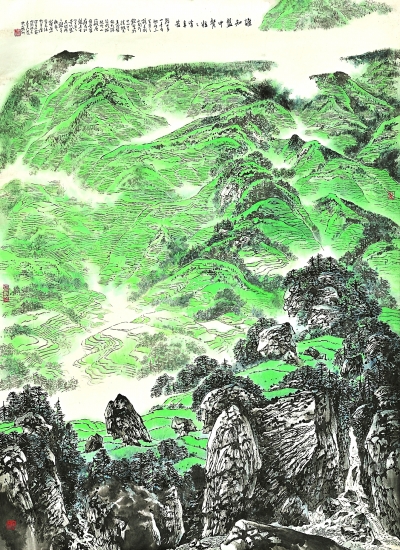 孙君良的中国画《谁知盘中餐 粒粒皆辛苦》描绘的是黔中山野梯田。风格上看仍是清新远逸的园林山水,但画家细细描绘一层一层的梯田,无论笔法还是题跋中,都饱含对人民生活的深情、对山水新貌的关注。