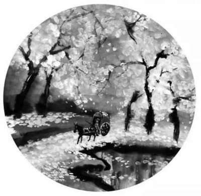 一幅水墨画的背后“暗藏”诗句:漫天落花似流水,轻车马骑穿林过,正是“纵被春风吹作雪,绝胜南陌碾成尘”的写照。选自林帝浣创作的《中国诗词大会》背景图。