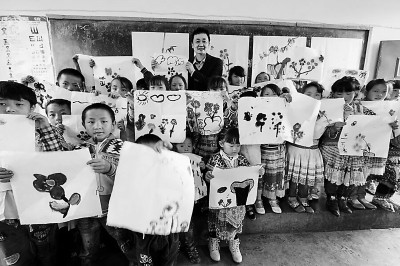 林帝浣为贵州威宁兴隆厂小学上书画课的场景。林帝浣说,如果能在同学们心中埋下一颗艺术和美的种子,或许这里将来能出大艺术家呢。