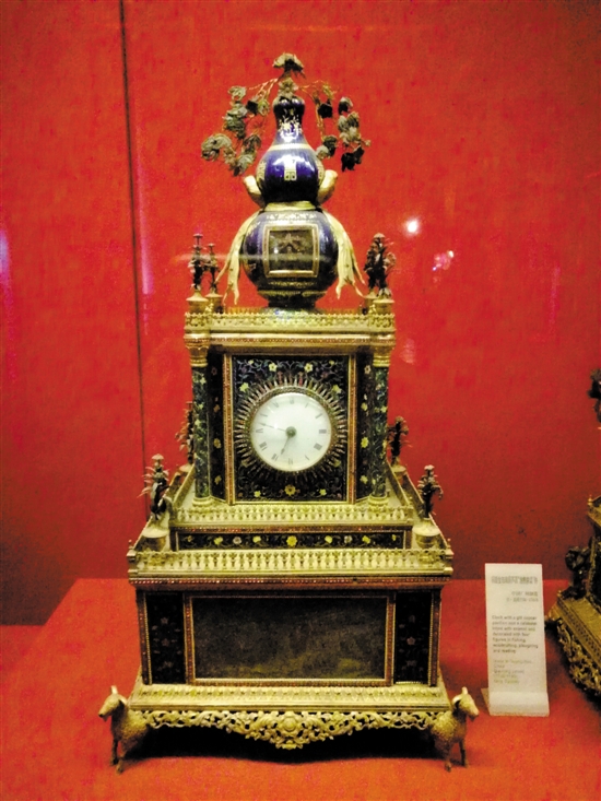 黄庆昌:从现存广钟藏品来看,广州钟表最为突出的一个特点,是其表面多为色彩鲜艳的各色珐琅。广钟掐丝珐琅的特点是掐丝生动,釉色鲜艳,其中以宝蓝珐琅贴金片最为突出,最为富丽堂皇。这种贴金银花的硬透明珐琅只有广州能生产,所以称“广珐琅”。