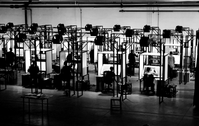 为了解决这些复杂的问题,制作团队开发了名为PAWS(Painted Animation Work Stations)的工作站系统,它包含了相机、电脑、投影、监视器、光源和画布等。每位参与的画师都经过了短期的培训,有一个开放的相对独立的小格子间工作站,既可相互交流,又能互不打扰。之前由演员实景拍摄、数字绘景所创建的动画视频作为参考物布置在画布上方,或者投影在画布上。画师能够更加专注于绘画本身,一帧接一帧地画下去。重复绘制的数量视很多情况而定,比如镜头的运动、人物的数量、运动的形式等,精确地控制每一帧的精度。最后,后期制作人员将油画师们绘制的油画通过电脑合成,制作成风格统一的油画电影。