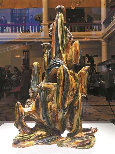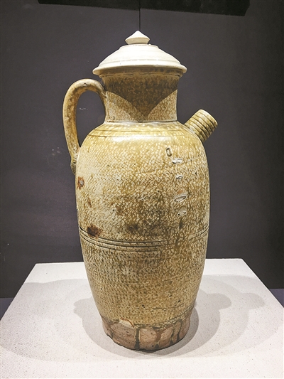 展场中,一件名为“白釉篮彩刻画人物图罐”格外突出,白釉整洁,而其上却淋洒着许多蓝釉斑点装饰。据介绍,这种蓝色不是源自中土,而是来自西域,唐三彩中的蓝色也是如此。
