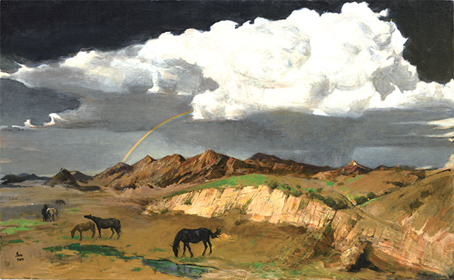 此次画展宣示了高山确已成为油画大家。他的油画渗透着中国西部大漠豪迈的气势,融西方油画的艺术手法,化为中国风格的油画结构,似又可见中国水墨画的意像手法,独具一格。